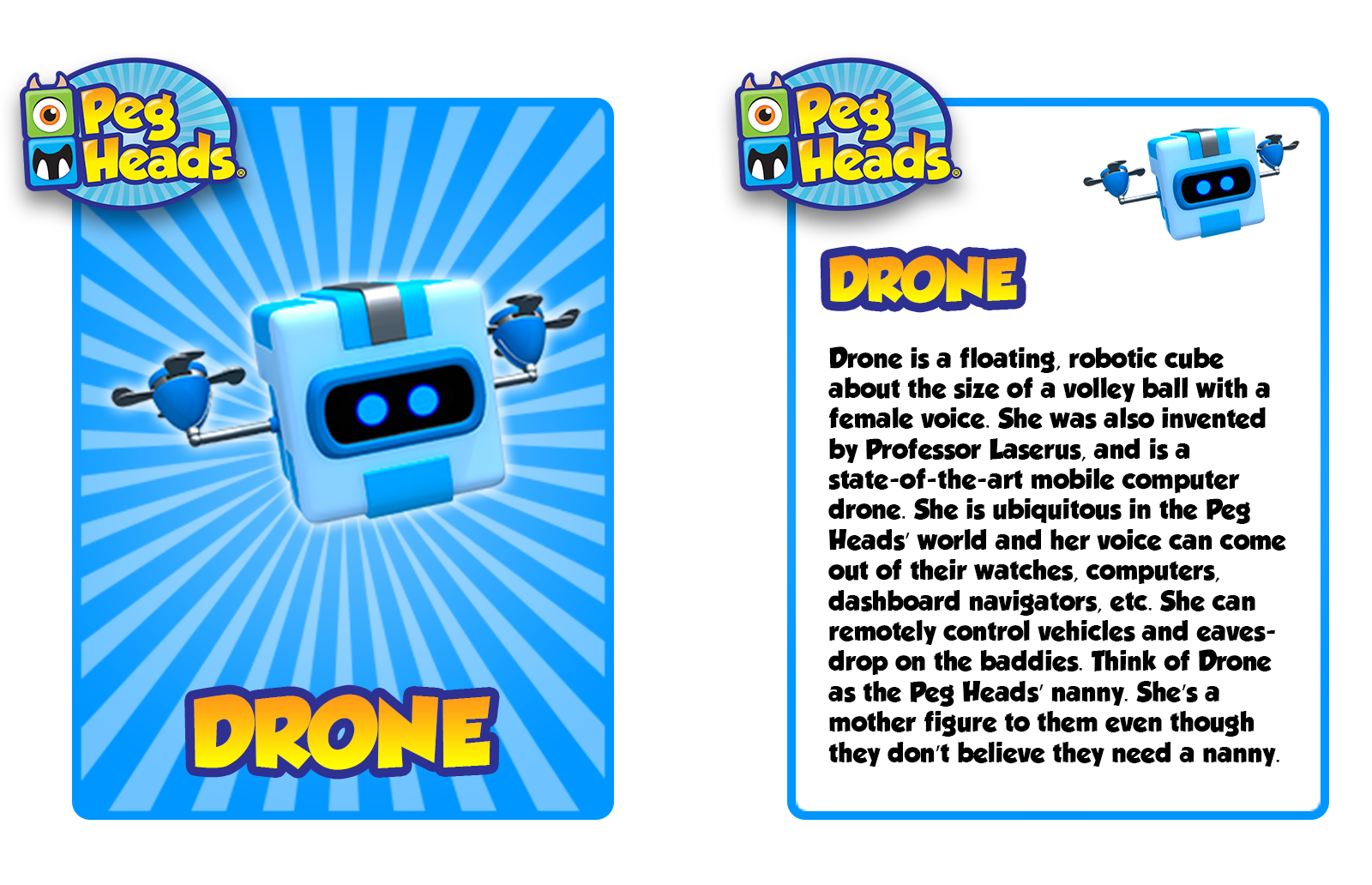 The Peg Heads is a no-holds-barred comedy-action series that brings the Laser Pegs toy line to life with unique and endearing characters who build and fly/drive/ride/sail colorful, glowing Laser Pegs vehicles and creatures. Our three heroes — ZIPPY, PEG & SPINNER — live on the island of New Pegland in the small town of Fruitville. From their underground headquarters — THE POWER CAVE — they are led by the brilliant but absent - minded scientist, PROFESSOR LASERUS, using Zippy’s miraculous invention — THE POWER PEG — to light up their Laser Pegs vehicles and structures.