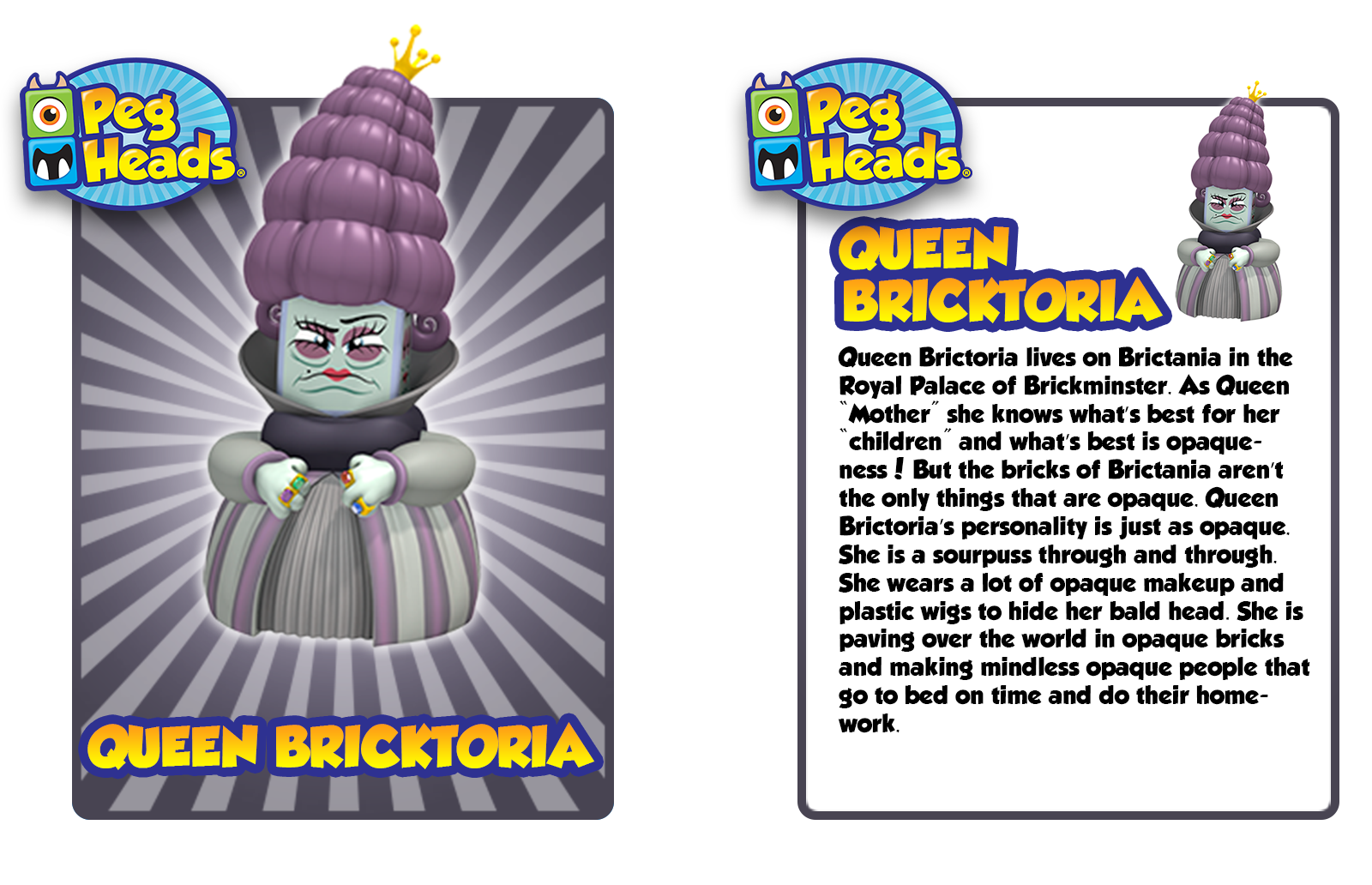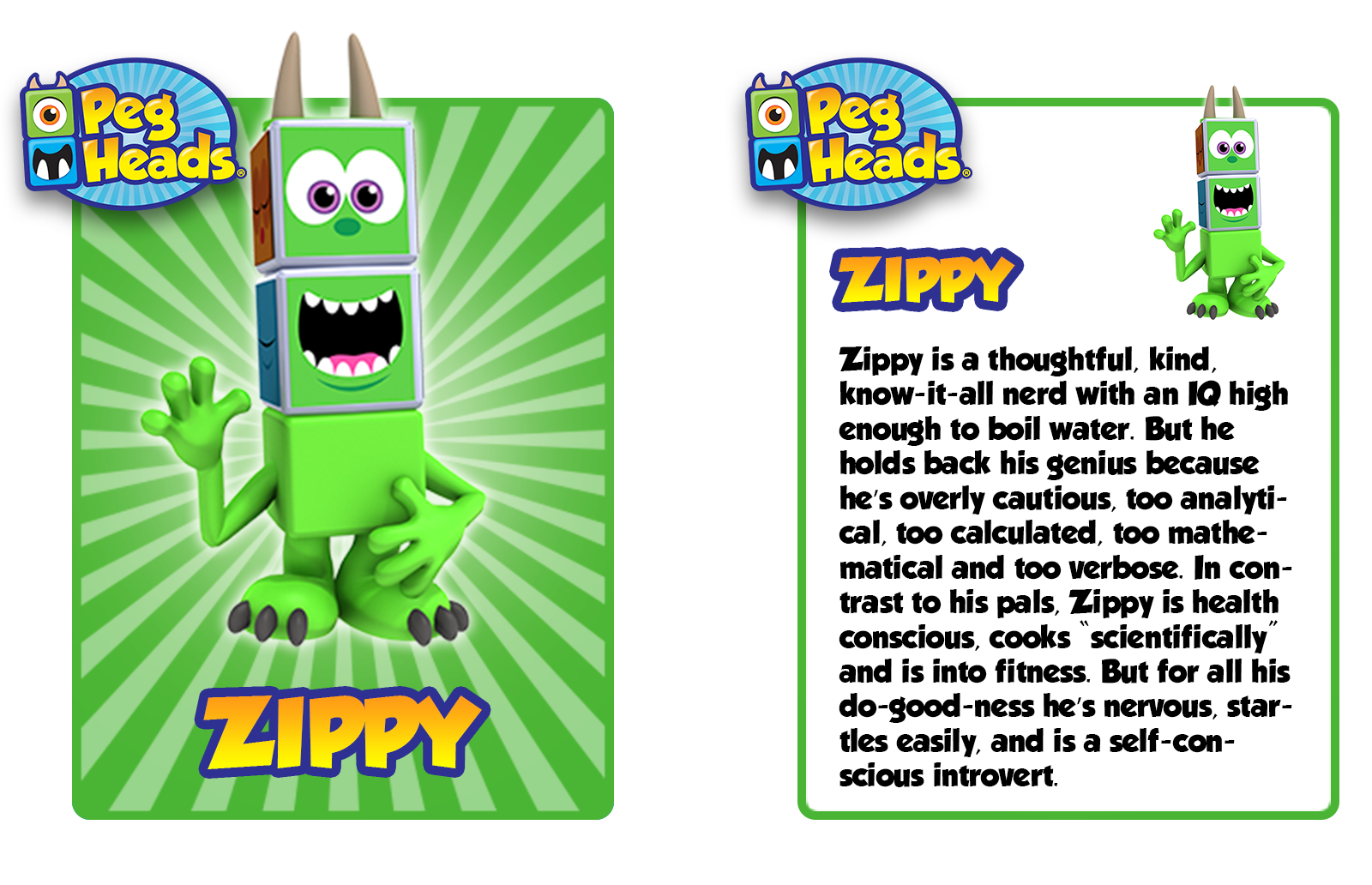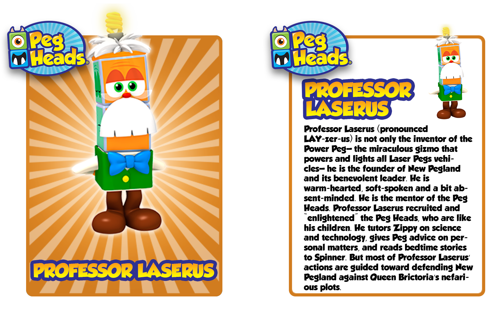 The Peg Heads is a no-holds-barred comedy-action series that brings the Laser Pegs toy line to life with unique and endearing characters who build and fly/drive/ride/sail colorful, glowing Laser Pegs vehicles and creatures. Our three heroes — ZIPPY, PEG & SPINNER — live on the island of New Pegland in the small town of Fruitville. From their underground headquarters — THE POWER CAVE — they are led by the brilliant but absent - minded scientist, PROFESSOR LASERUS, using Zippy’s miraculous invention — THE POWER PEG — to light up their Laser Pegs vehicles and structures.
